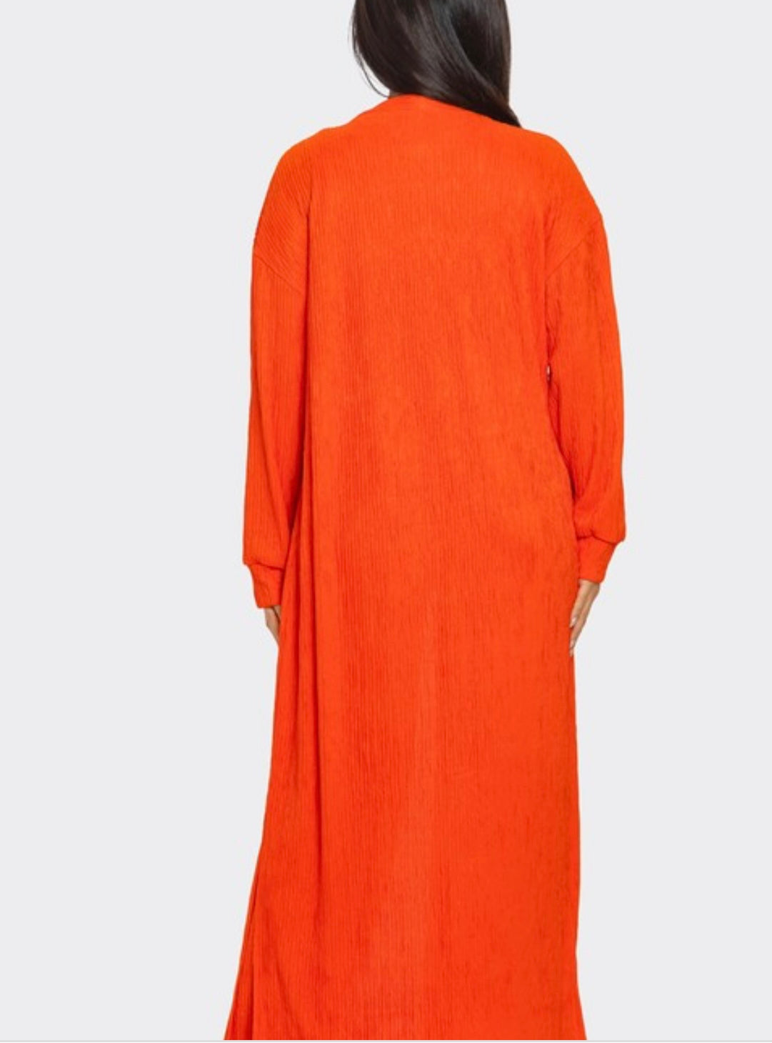 -Long Sleeve -Open Cardigan- Pants with crop top -Front Pockets -Side Slits -Crinkle Textured Fabric Wear casual or dressy,
