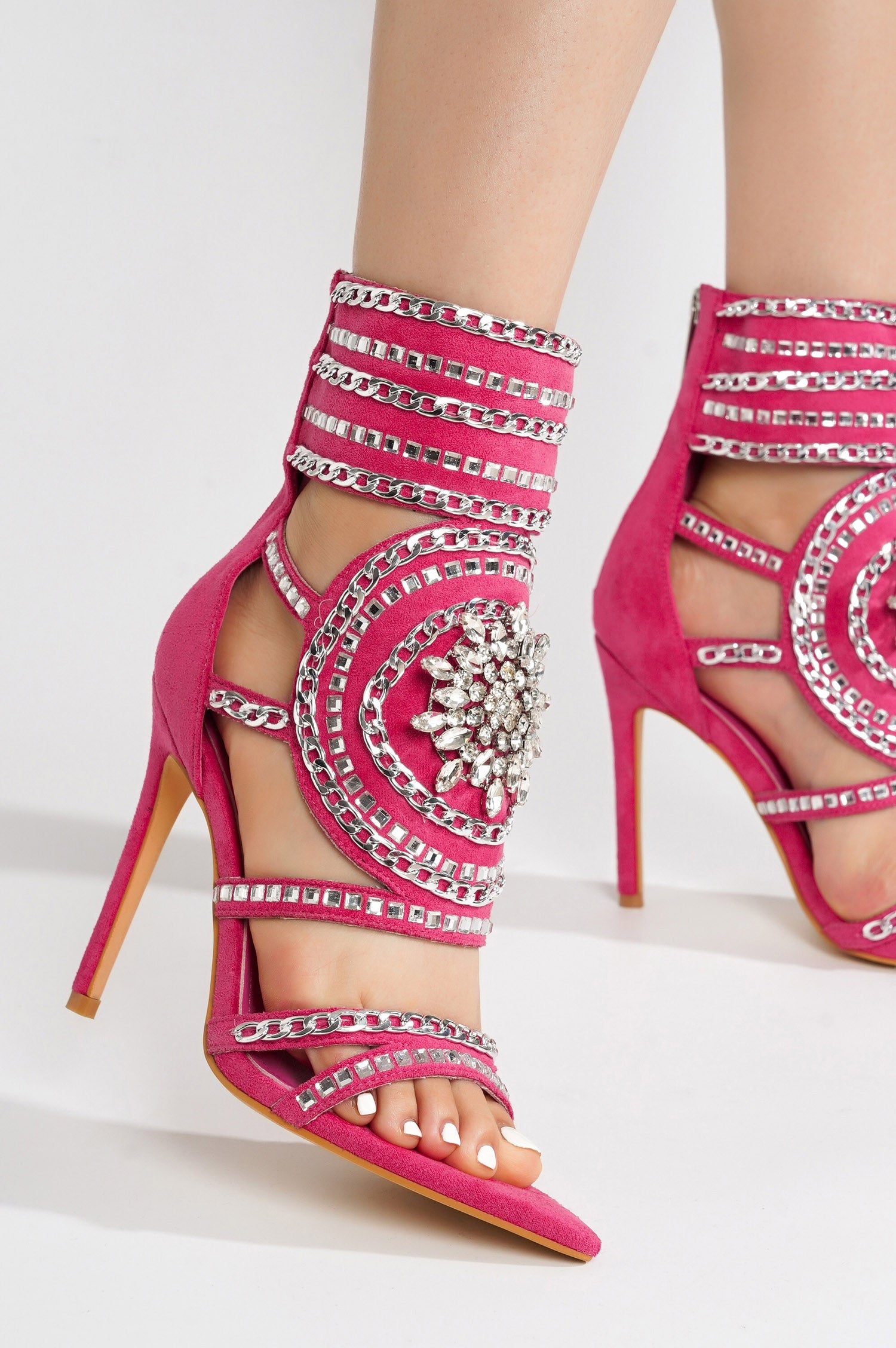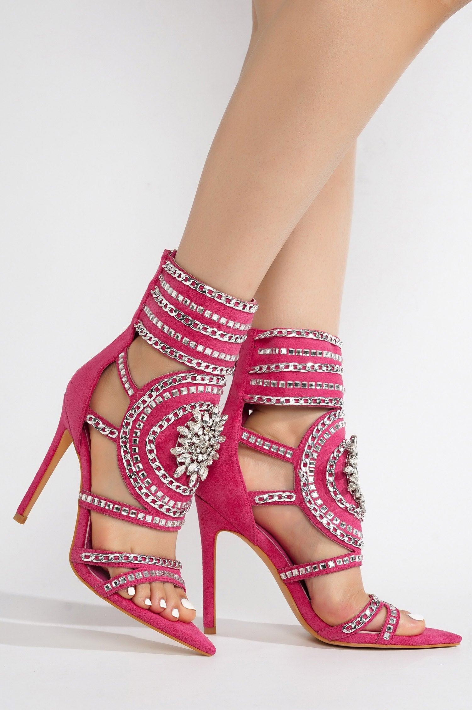 These heels demand attention! Clarysalyn adds extra confidence to your step. Features a brilliant gem brooch on the vamp for a memorable vibe,chain-trimmed multi-straps for a touch of edge,and sturdy high heels to balance the perfect look. Comes in black,white,pink,orange,or green.