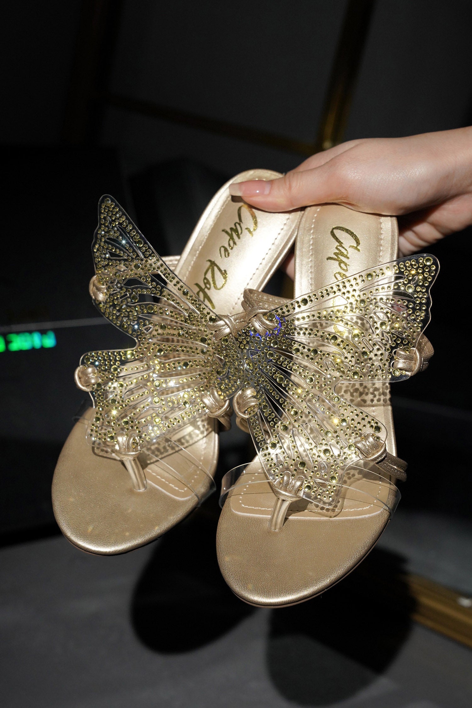 Crafted with meticulous attention to detail,these exquisite heels feature a delicate butterfly motif adorned with sparkling rhinestones,adding a touch of glamour to any ensemble.